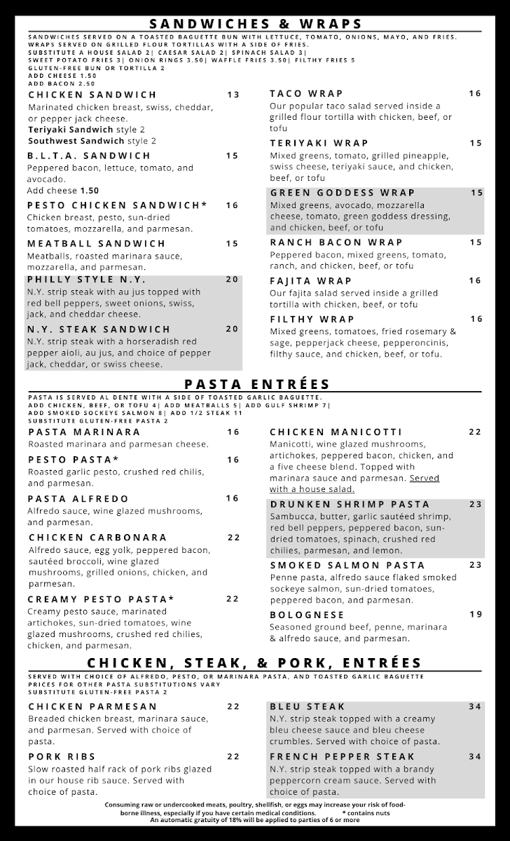 The menu invites diners to enjoy flavorful meals in a cozy, unpretentious setting—whether it’s a midday lunch break or an evening shared with loved ones. Alongside satisfying entrées, there are fresh salads and wraps that pair well with the laid-back atmosphere. Drinks like the Cinnamon Maple Whiskey Sour or a refreshing Margarita round out the experience with subtle complexity, complementing both casual bites and richer dishes.